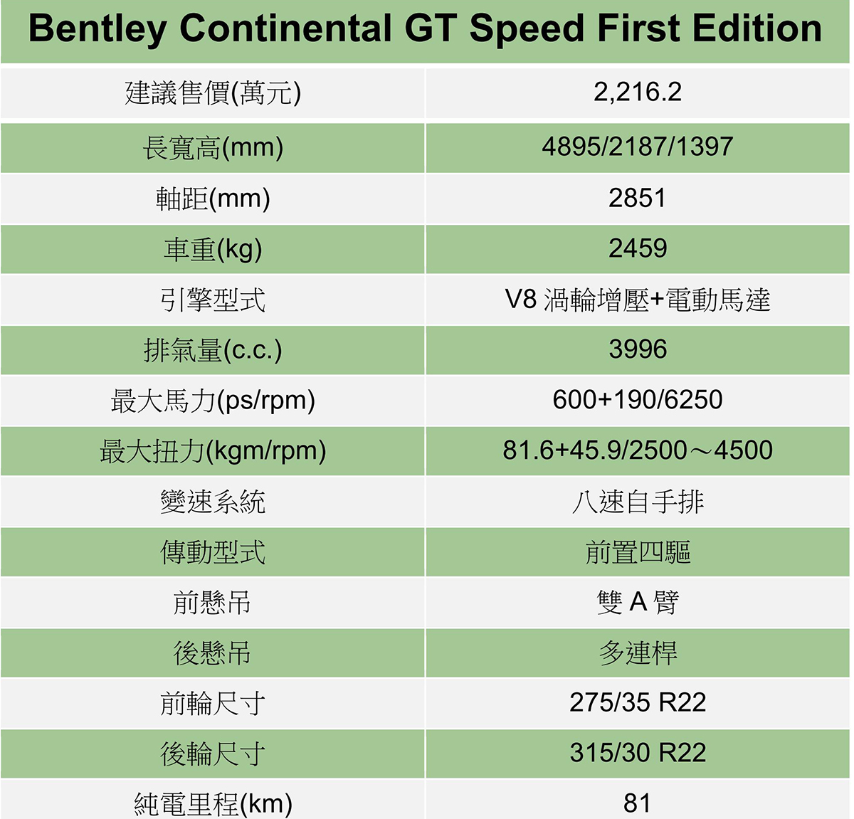 而說到性能全新第四代Continental GT Speed動力系統從6.0升W12改為4.0升V8,就引擎排量與汽缸數來說算是降級,但Bentley在因應電能化計畫導入PHEV插電式油電系統,使其原先就已具備600ps/81.6kgm最大動力的4.0升V8渦輪引擎,又額外獲得190ps最大馬力與45.9kgm峰值扭力,如此一來動力來到高達782ps/102kgm,而此規格也較W12引擎增加19%馬力、11%扭力,搭配八速自手排變速系統0~100km/h加速僅需3.2秒即可完成,極速更是上看335km/h。