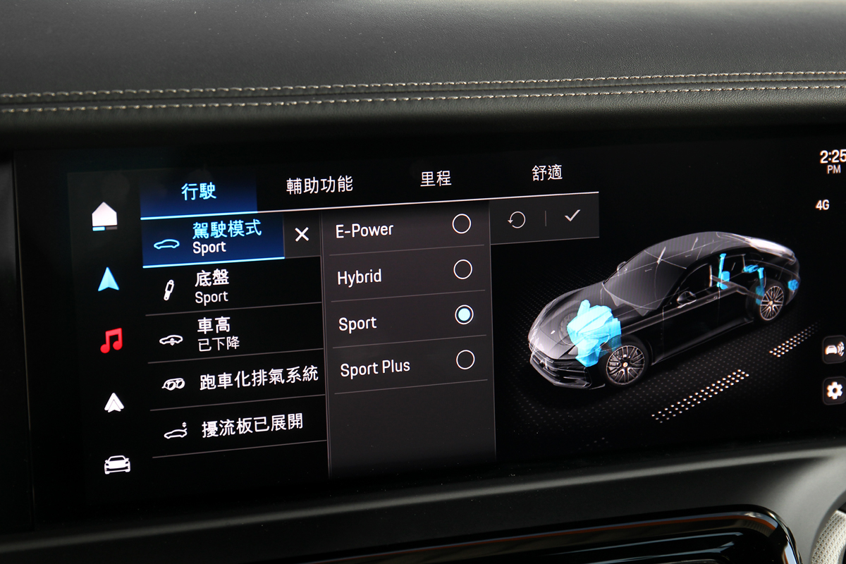 相較於動力加速Panamera Turbo E-Hybrid彎裡表現更讓人驚豔與印象深刻,Panamera Turbo E-Hybrid標配主動式氣壓懸吊,試駕車另外亦選配Active Ride主動車高控制系統,該系統取消傳統防傾桿並能獨立控制個懸吊車高與阻尼,除開門時提升高度利於上下車外,最大助益就是提升車輛操控表現。