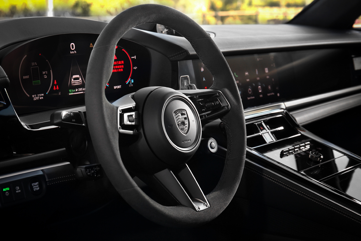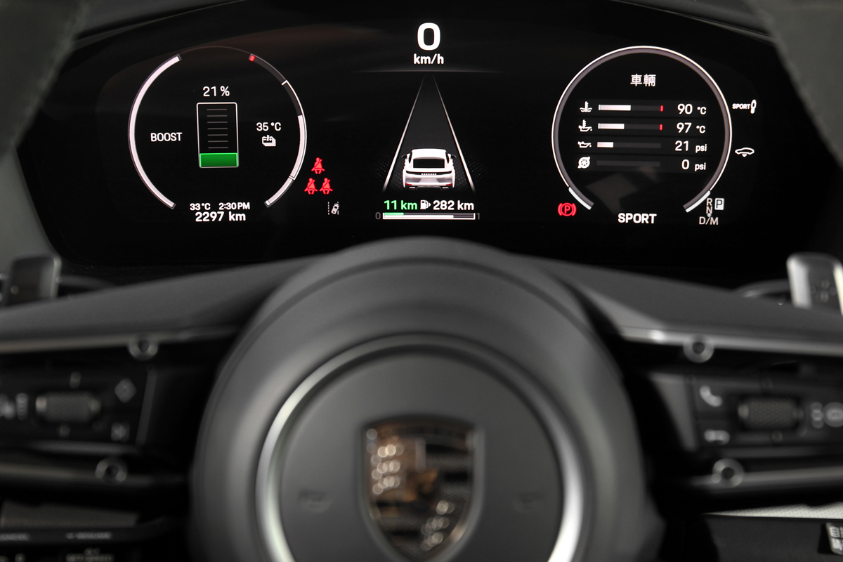 選購Porsche車款很難不在選配清單東勾西勾的,但Panamera Turbo E-Hybrid 1,241萬元的售價已是車系最頂級車型,因此如雙前座18向電動調整跑車座椅、主動式氣壓懸吊PASM、4D底盤控制系統、跑車計時套件、高解析度LED矩陣式頭燈、GT跑車式方向盤、車道維持輔助…等系統。不過試駕車型仍選了21吋Panamera Turbo S輪圈、SportDesign造型外觀套件、全景式電動天窗、Active