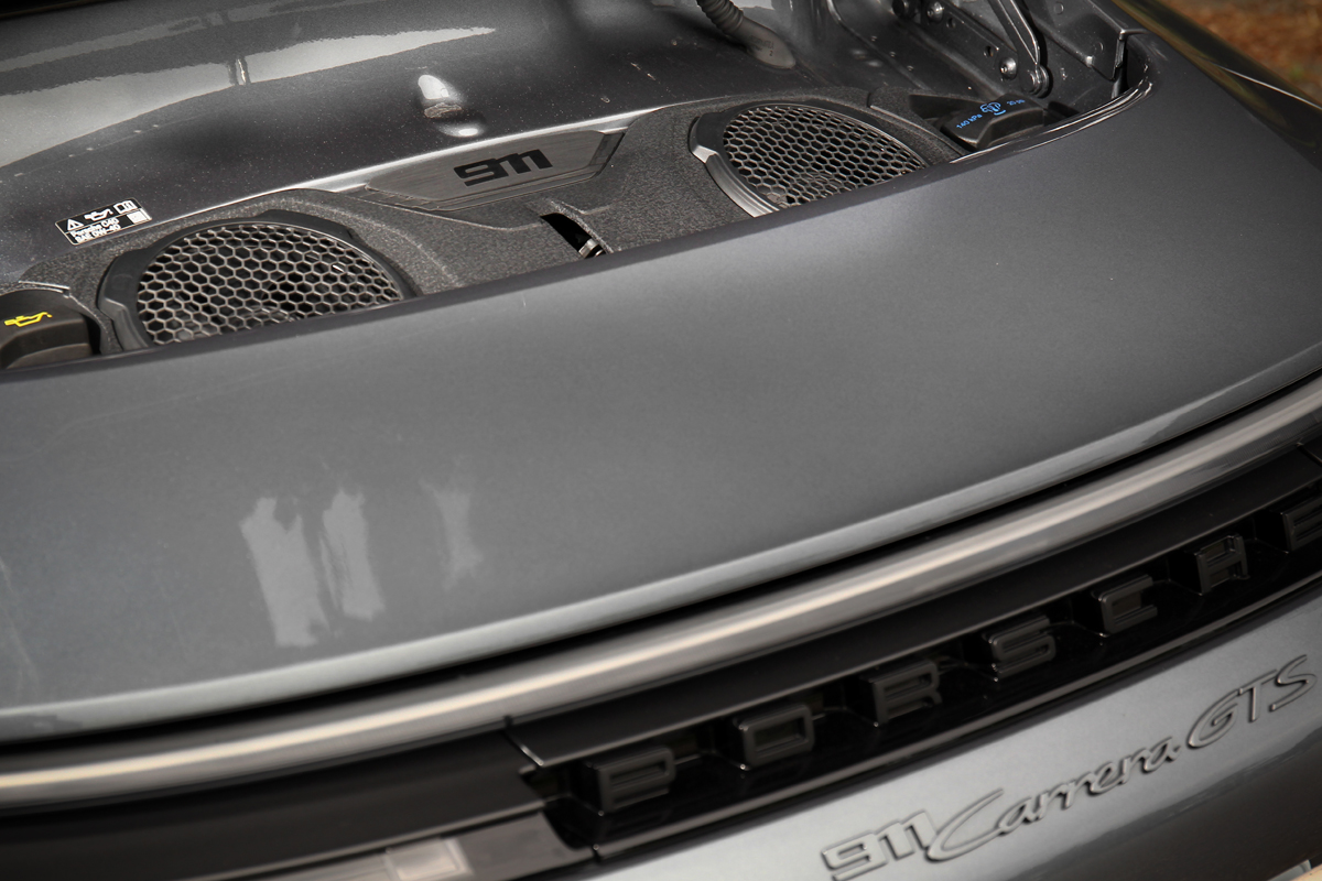 911 Carrera GTS除動力系統進化,外觀方面變動也較911 Carrera來得明顯,直列主動式冷卻通風葉片格柵是992.2世代最顯著的轉變,而此主動式格柵也搭配主動式前下擾流,能依不同動態情況進行調節氣流。在此基礎上試駕車型也選配碳纖維SportDesign外觀套件、碳纖維三角窗飾板、跑車造型鈦合金排氣管、燻黑高解析度LED矩陣式頭燈與Exclusive Design尾燈等進一步突顯性能氣勢。而車室部分也選配雙前座十八向電動調整/通風跑車座椅、天窗、陶瓷色霧面碳纖飾板、麂皮/碳纖維飾板GT跑車式方向盤、主動停車輔助含環景輔助攝影與ACC等項目。
