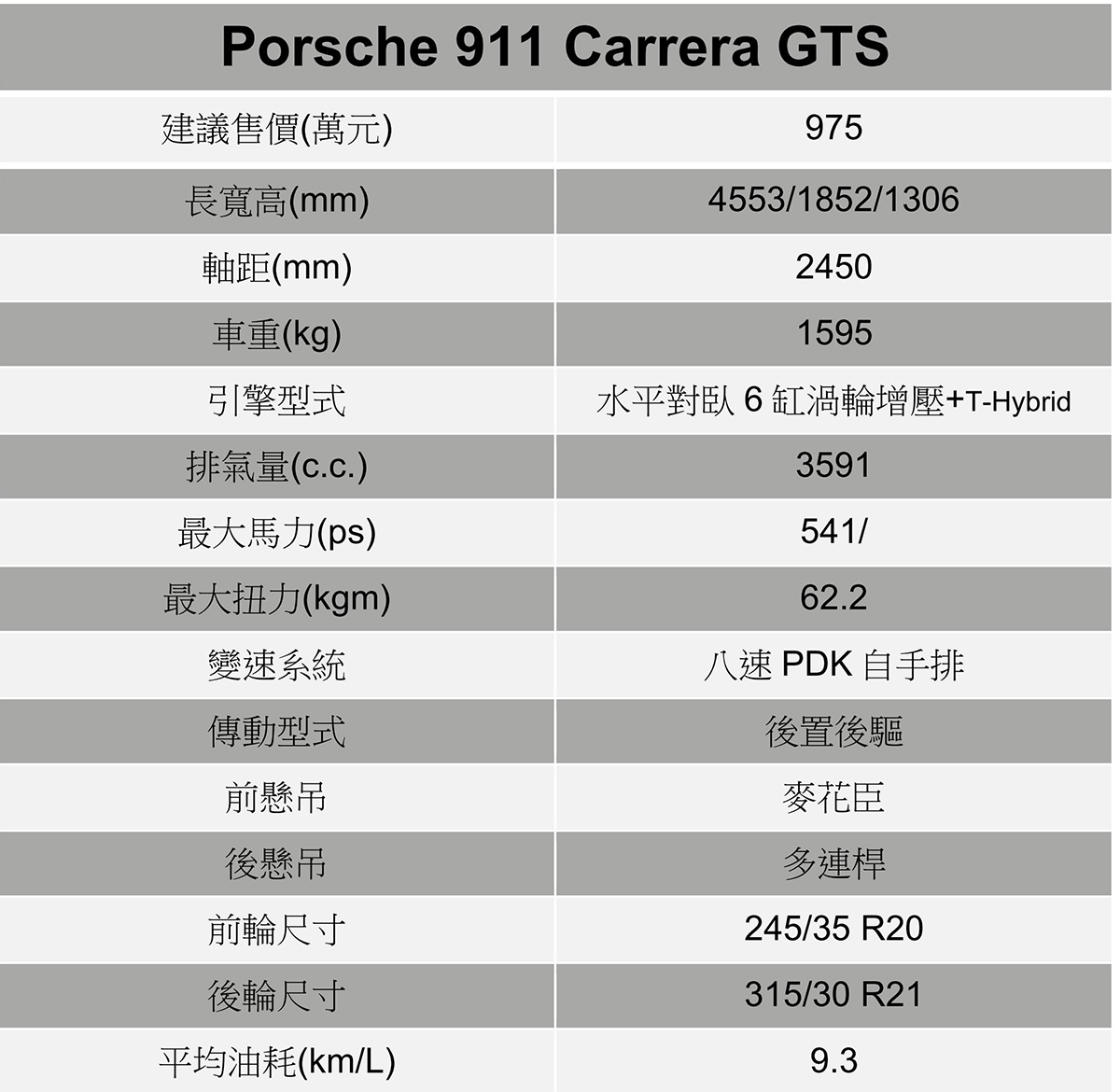 992.2世代911雖為小改車型,但Porsche卻在911 Carrera GTS車型帶來重大變革導入T-Hybrid油電系統,這也讓911從氣冷、水冷、全渦輪邁入電能化時代。
