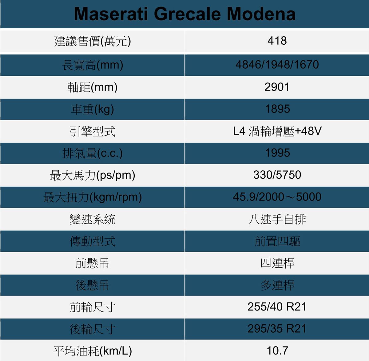 義大利不僅善於營造高級質感,動態調校更是有獨到見解,Grecale Modena搭載一具2.0升渦輪引擎+48V輕油電系統,提供330hp最大馬力與45.9kgm峰值扭力,此性能數據也助Grecale Modena能在5.3秒完成0~100km/h加速衝刺,極速也有240km/h水準。