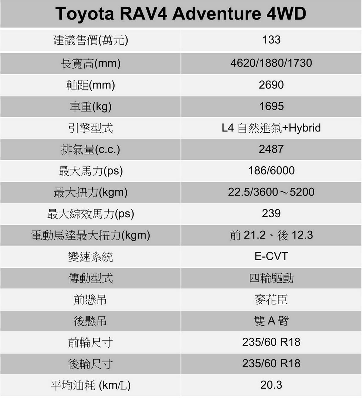 最強大的地方在於,全新大改款RAV4還被總代理和泰賦予了相當漂亮的訂價,其中RAV4自104萬元起至130萬元,所試駕的RAV4 Adventure則以133萬元開出,至於最具性能色彩的RAV4 GR Sport則要價139萬元,不僅對比新世代進口中型SUV對手毫無懼色,相較改款前同樣滿滿誠意,頗有打算「整碗捧走」的霸氣想像。