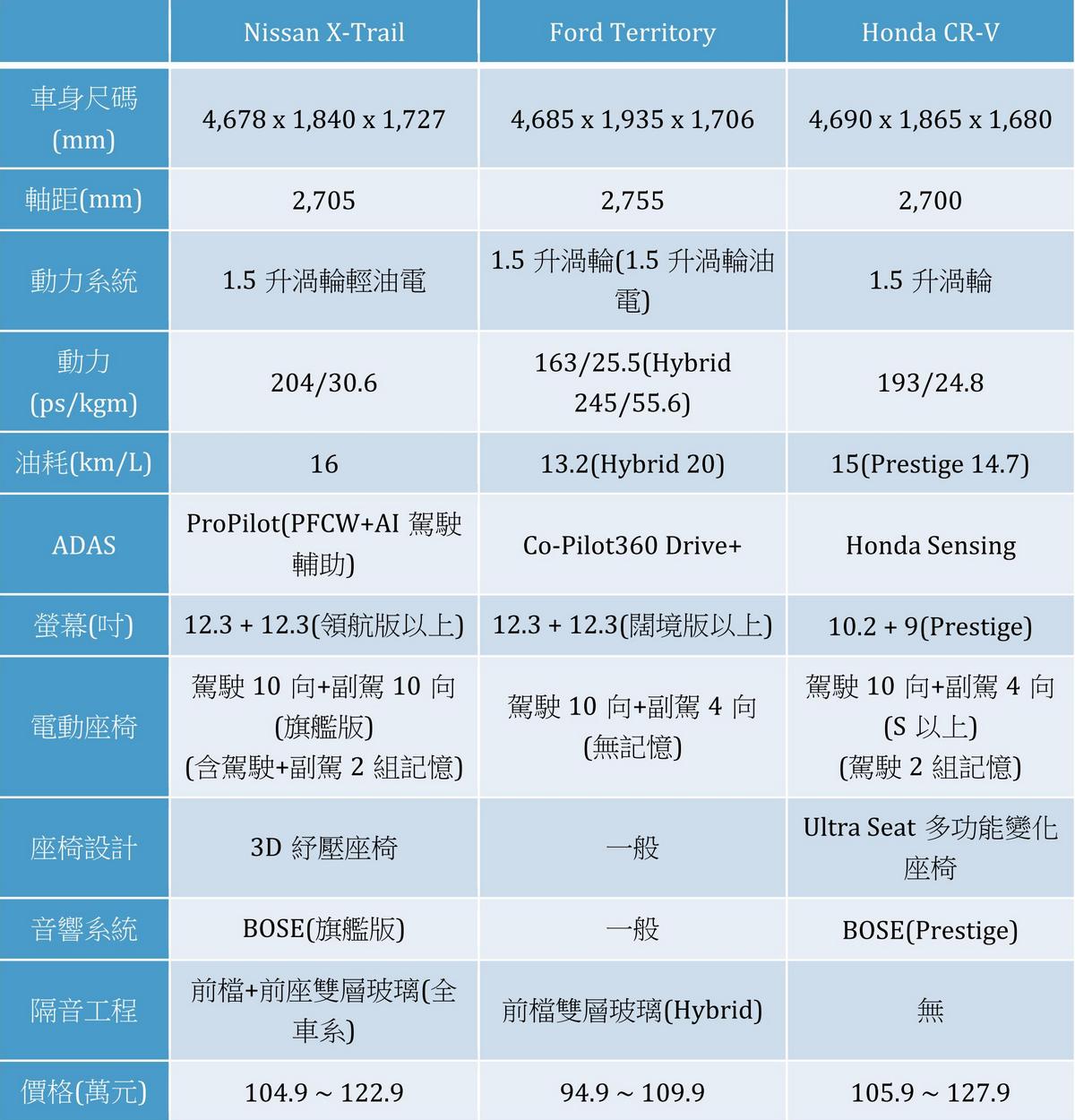由表格可察覺儘管在價格上Ford Territory較對手具備一定程度優勢,而Honda CR-V則透過超聰明Ultry Seat多功能變座椅帶來靈活乘載機能,但Nissan X-Trail卻在動力與油耗、隔音工程、乘坐舒適性(如3D超體感紓壓座椅與副駕10向電動調整含2組記憶)及科技面向(如雙12.3吋數位儀錶與中央螢幕與BOSE音響系統)等項目表現優異,至於數據規格外,Nissan X-Trail更討喜的部分則展現在實際體驗面向,而這部分,正是我們這次試駕的最重點。
