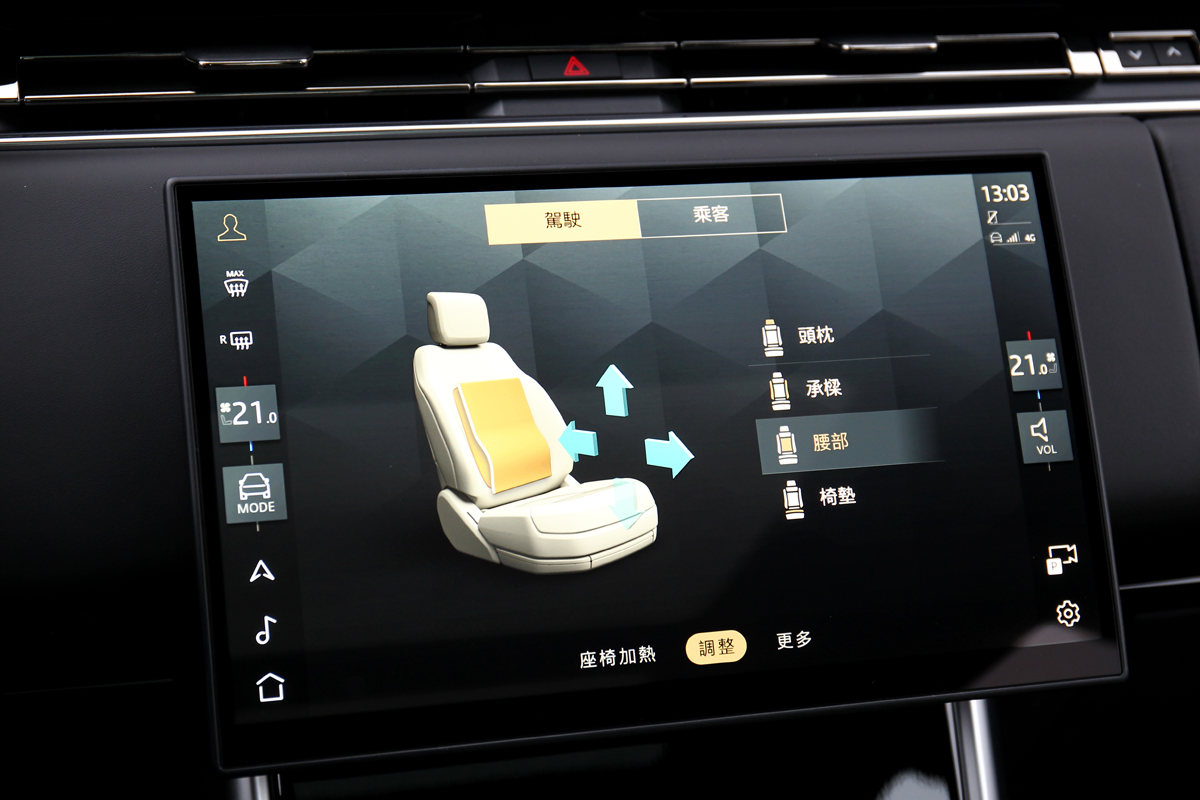 坐進Range Rover 2025年式限定版,則是選檀木黑Windsor leather溫莎皮革座椅搭配檀木黑內裝、車內頂篷、尊貴黑飾板迎接車主,雖沒有醒目淺色鋪陳和炫技配置,黑色內裝不僅呼應外觀內斂沉穩,同時也符合多數消費者喜好。