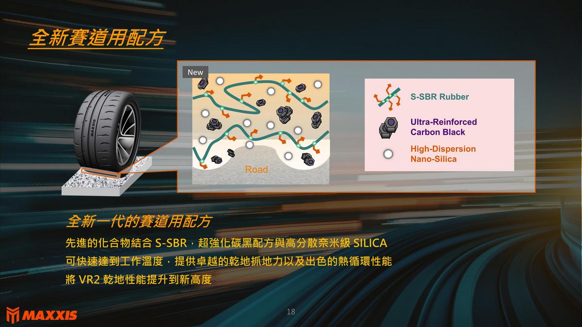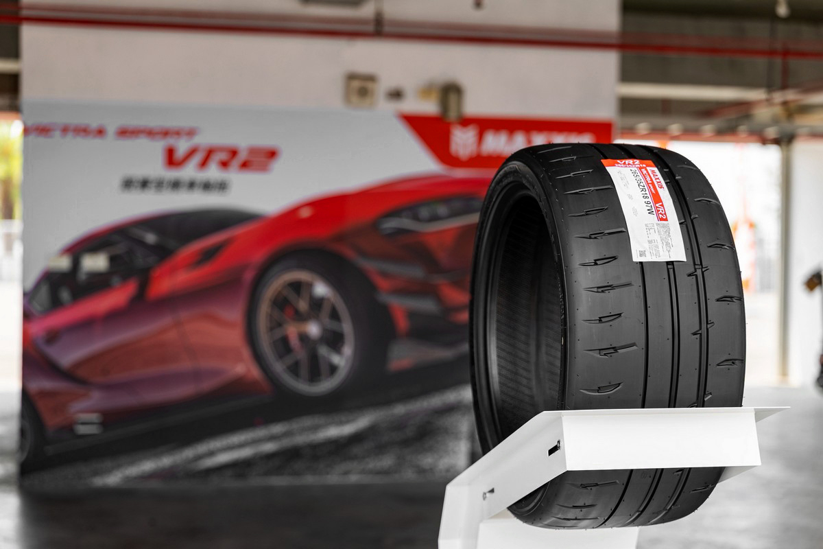此次除了試駕VSEV+輪胎,同場也加碼 Victra Sport VR2高性能競技胎體驗,Victra Sport VR2採用賽道級膠料配方,Victra Sport VR2的化合物結合S-SBR,強化碳黑配方與高分散奈米級Silica能讓輪胎快速達到工作溫度提供抓地力。胎紋方面Victra Sport VR2採2+1寬主溝和胎肩邊緣倒角設計,在強化乾地抓地力同時也加強剛性,另外刀鋒式破水溝槽其斜面刀形溝槽能有效破除水膜提升濕地排水性能,不僅如此胎側全部位厚度與剛性也有所增加。